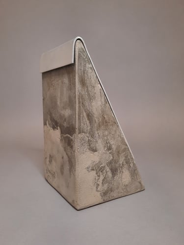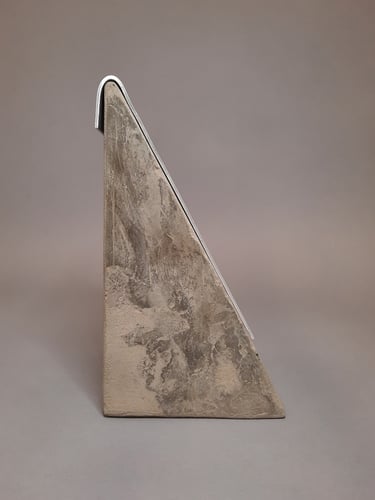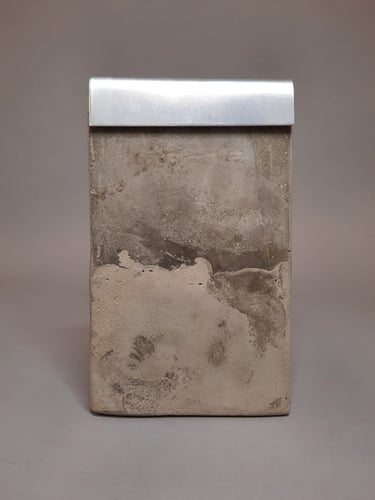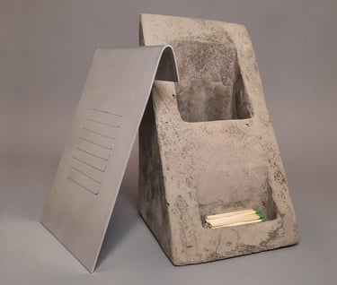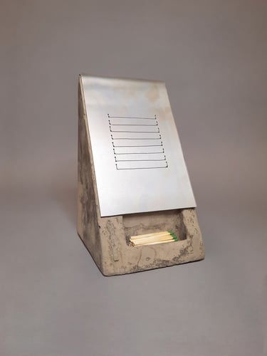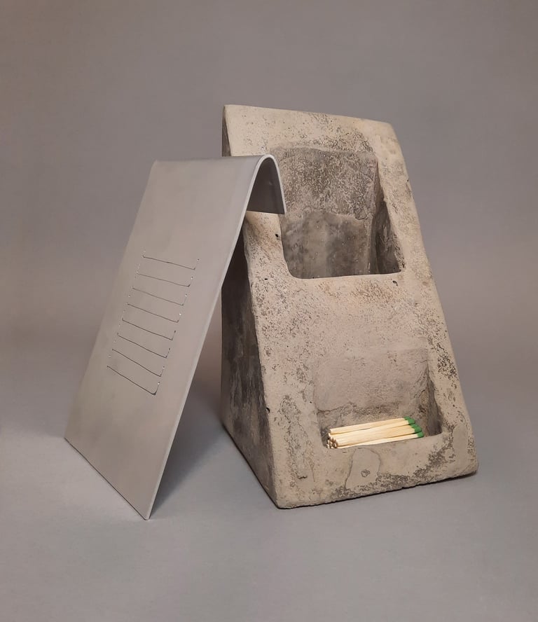 “Fire Box” explores themes of loss, release, and transformation of both physical items and the value we place onto them. Fire box is a resting place and striking block for a humble match, with a larger and deeper opening which is empty. This opening exists as a furnace for the user to place an active match along with the fuel of their choice. An aluminum lid acts as a vent to direct smoke and heat upwards. The base form and materiality is inspired by a gabled-roof home where I experienced physical loss through fire, neglect, and theft. The home and it’s contents were damaged by a furnace fire, which made the choice of lid as a furnace register form appropriate. Fire Box is either a match holder or a furnace based on the user’s answer to the question - “what are you willing to let go of?”