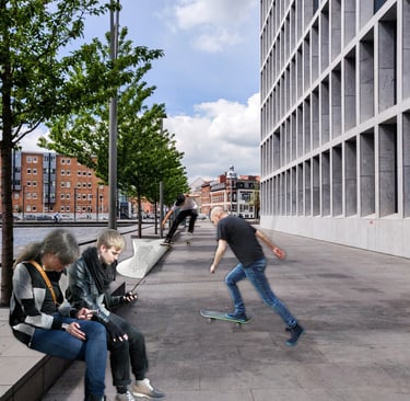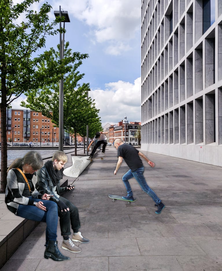RR is a versatile feature designed to reclaim city sidewalks for the functions of rest and alternative movement. This multi-use element meets a large range of needs for all users by functioning as a seating component and skate feature. Inspired by the forms of skatepark obstacles and skate wheels, RR reclaims valuable public space by extending sidewalks for recreational use. Constructed from a unique hybrid material of recycled urethane skate wheels and concrete, the feature reclaims material waste created by the skate industry to create a durable sidewalk addition. Retired wheels can be deposited into the feature to be repurposed into the next RR fixture.