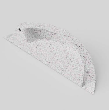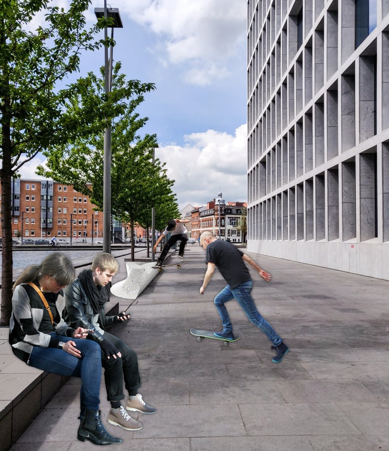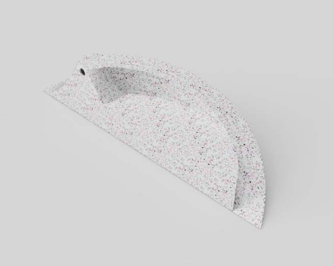 RR is a versatile feature designed to reclaim city sidewalks for the functions of rest and alternative movement. This multi-use element meets a large range of needs for all users by functioning as a seating component and skate feature. Inspired by the forms of skatepark obstacles and skate wheels, RR reclaims valuable public space by extending sidewalks for recreational use. Constructed from a unique hybrid material of recycled urethane skate wheels and concrete, the feature reclaims material waste created by the skate industry to create a durable sidewalk addition. Retired wheels can be deposited into the feature to be repurposed into the next RR fixture.