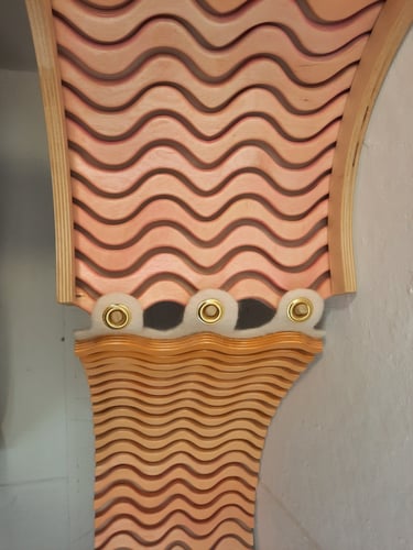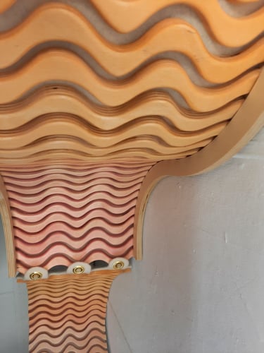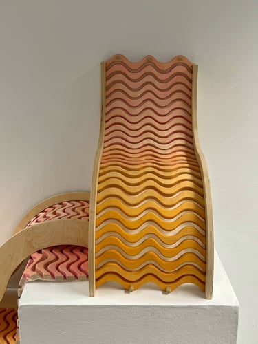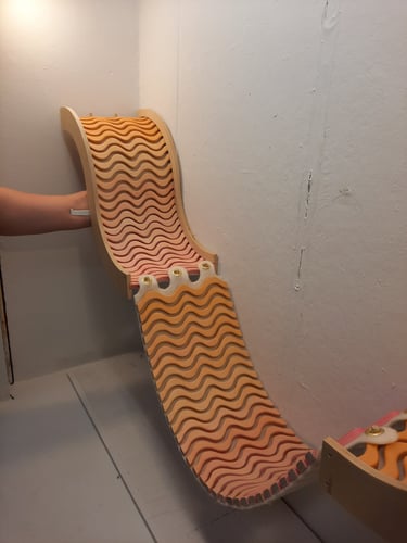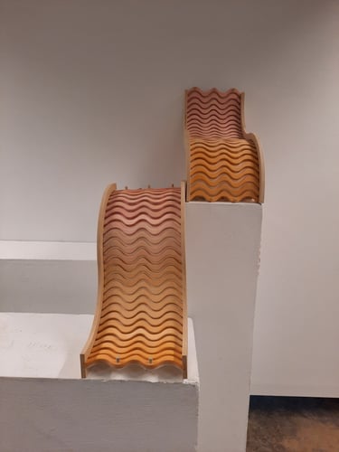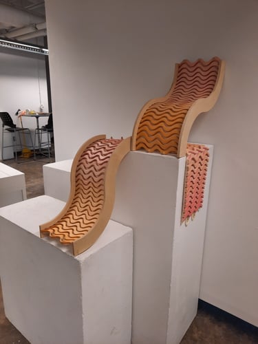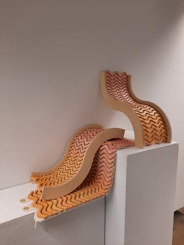 Inspired by play and motion, SQUIGL is a series of modular shelving units. Two mirrored non-uniform spline frames house a track of tambour-mounted and dyed wooden squiggly lines on a natural wool felt membrane backing. Connected by a string of dowel pegs and brass grommets, a playful drawbridge moves across the two larger shelving components. This drawbridge wiggles and sways with interaction, in addition to conforming to hold whatever is stored. These three components of SQUIGL can be multiplied and arranged to create any number of sequences - the pieces fit together like a puzzle. The squiggly line that composes the form of the framing and tessellating tambour was discovered early on in ideation. Drawn from the architecture of skate spaces as well as mathematical waves, it playfully communicates movement as well as easily lending itself to a repeating pattern, perfectly complimenting it's function as modular shelving